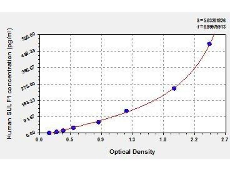 Antibody specific for SULF1 has been pre-coated onto a microplate. Standards and samples are pipetted into the wells and any SULF1 present is bound by the immobilized antibody. After removing any unbound substances, a biotin-conjugated antibody specific for SULF1 is added to the wells. After washing, avidin conjugated Horseradish Peroxidase (HRP) is added to the wells. Following a wash to remove any unbound avidin-enzyme reagent, a substrate solution is added to the wells and color develops in proportion to the amount of SULF1 bound in the initial step. The color development is stopped and the intensity of the color is measured.