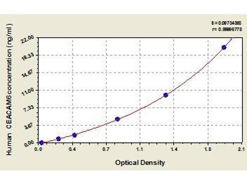 This assay employs the quantitative sandwich enzyme immunoassay technique. Antibody specific for CEACAM6 has been pre-coated onto a microplate. Standards and samples are pipetted into the wells with a Horseradish Peroxidase (HRP) conjugated antibody specific for CEACAM6. Following a wash to remove any unbound reagent, a substrate solution is added to the wells and color develops in proportion to the amount of CEACAM6 bound in the initial step. The color development is stopped and the intensity of the color is measured.