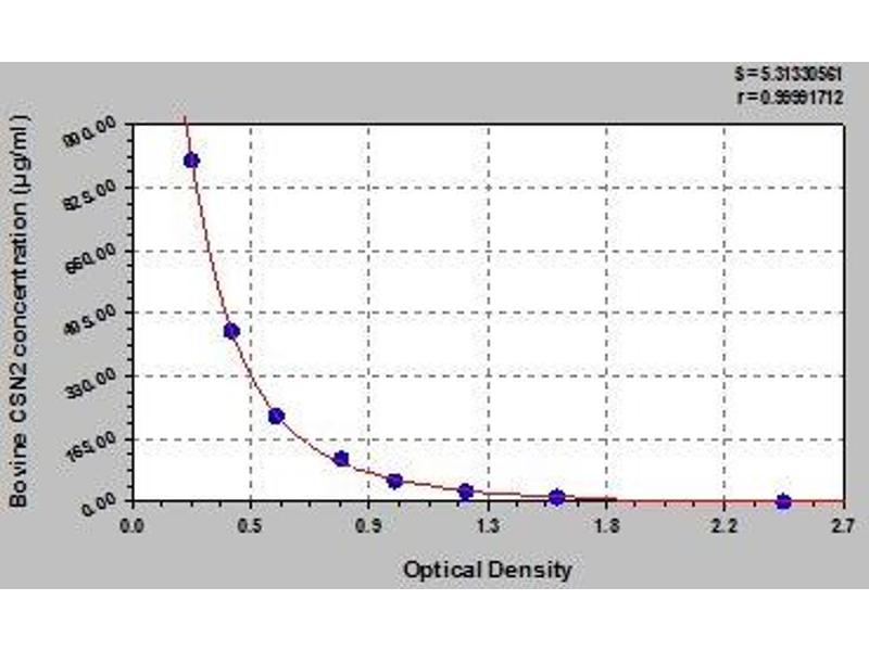 - Antibody specific for CSN2 has been pre-coated onto a microplate. Standards and samples are pipetted into the wells and any CSN2 present is bound by the immobilized antibody. After removing any unbound substances, a biotin-conjugated antibody specific for CSN2 is added to the wells. After washing, avidin conjugated Horseradish Peroxidase (HRP) is added to the wells. Following a wash to remove any unbound avidin-enzyme reagent, a substrate solution is added to the wells and color develops in proportion to the amount of CSN2 bound in the initial step. The color development is stopped and the intensity of the color is measured.