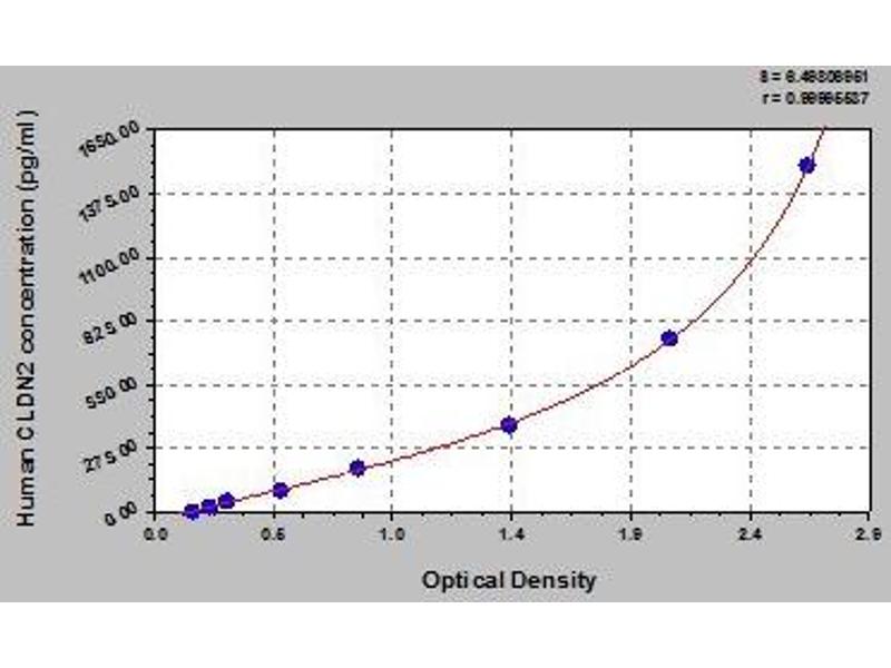 - Antibody specific for CLDN2 has been pre-coated onto a microplate. Standards and samples are pipetted into the wells and any CLDN2 present is bound by the immobilized antibody. After removing any unbound substances, a biotin-conjugated antibody specific for CLDN2 is added to the wells. After washing, avidin conjugated Horseradish Peroxidase (HRP) is added to the wells. Following a wash to remove any unbound avidin-enzyme reagent, a substrate solution is added to the wells and color develops in proportion to the amount of CLDN2 bound in the initial step. The color development is stopped and the intensity of the color is measured.