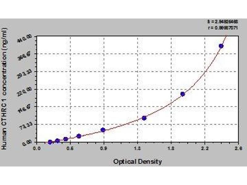 - Antibody specific for CTHRC1 has been pre-coated onto a microplate. Standards and samples are pipetted into the wells and any CTHRC1 present is bound by the immobilized antibody. After removing any unbound substances, a biotin-conjugated antibody specific for CTHRC1 is added to the wells. After washing, avidin conjugated Horseradish Peroxidase (HRP) is added to the wells. Following a wash to remove any unbound avidin-enzyme reagent, a substrate solution is added to the wells and color develops in proportion to the amount of CTHRC1 bound in the initial step. The color development is stopped and the intensity of the color is measured.