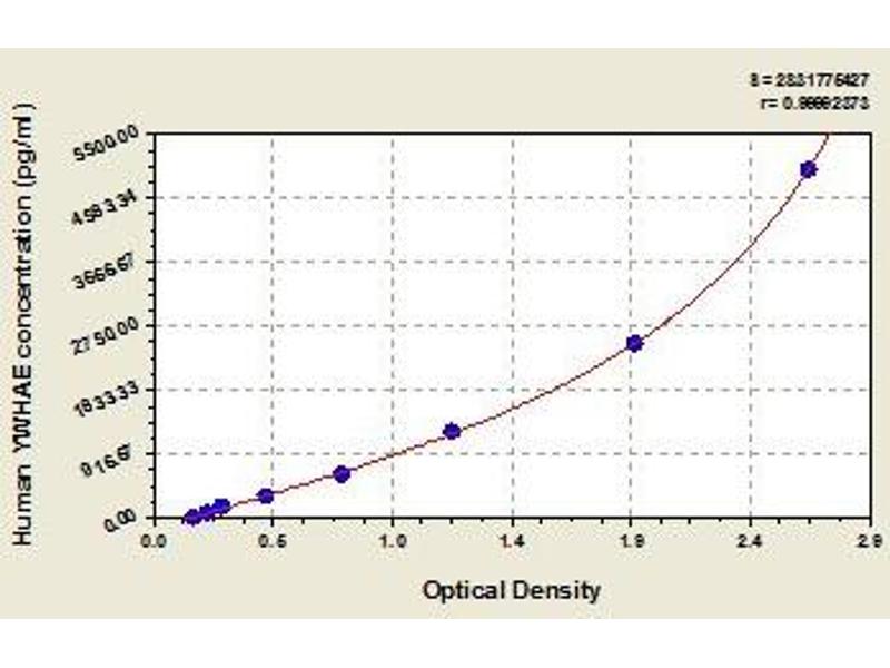 Antibody specific for YWHAE has been pre-coated onto a microplate. Standards and samples are pipetted into the wells and any YWHAE present is bound by the immobilized antibody. After removing any unbound substances, a biotin-conjugated antibody specific for YWHAE is added to the wells. After washing, avidin conjugated Horseradish Peroxidase (HRP) is added to the wells. Following a wash to remove any unbound avidin-enzyme reagent, a substrate solution is added to the wells and color develops in proportion to the amount of YWHAE bound in the initial step. The color development is stopped and the intensity of the color is measured.