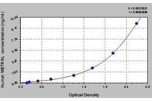 - Antibody specific for METRNL has been pre-coated onto a microplate. Standards and samples are pipetted into the wells and any METRNL present is bound by the immobilized antibody. After removing any unbound substances, a biotin-conjugated antibody specific for METRNL is added to the wells. After washing, avidin conjugated Horseradish Peroxidase (HRP) is added to the wells. Following a wash to remove any unbound avidin-enzyme reagent, a substrate solution is added to the wells and color develops in proportion to the amount of METRNL bound in the initial step. The color development is stopped and the intensity of the color is measured.