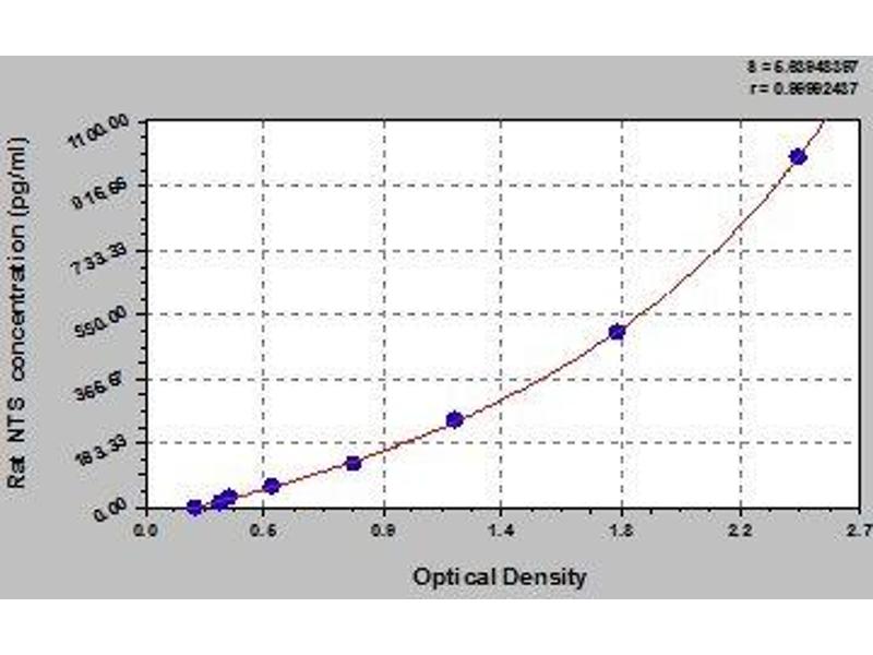 Antibody specific for NTS has been pre-coated onto a microplate. Standards and samples are pipetted into the wells and any NTS present is bound by the immobilized antibody. After removing any unbound substances, a biotin-conjugated antibody specific for NTS is added to the wells. After washing, avidin conjugated Horseradish Peroxidase (HRP) is added to the wells. Following a wash to remove any unbound avidin-enzyme reagent, a substrate solution is added to the wells and color develops in proportion to the amount of NTS bound in the initial step. The color development is stopped and the intensity of the color is measured.