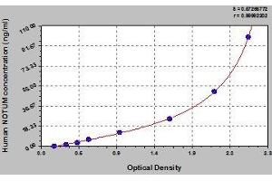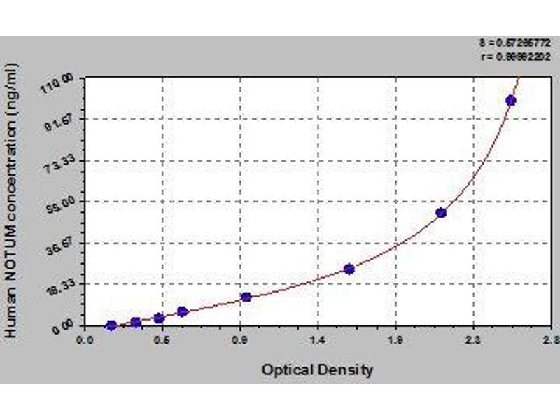 - Antibody specific for NOTUM has been pre-coated onto a microplate. Standards and samples are pipetted into the wells and any NOTUM present is bound by the immobilized antibody. After removing any unbound substances, a biotin-conjugated antibody specific for NOTUM is added to the wells. After washing, avidin conjugated Horseradish Peroxidase (HRP) is added to the wells. Following a wash to remove any unbound avidin-enzyme reagent, a substrate solution is added to the wells and color develops in proportion to the amount of NOTUM bound in the initial step. The color development is stopped and the intensity of the color is measured.