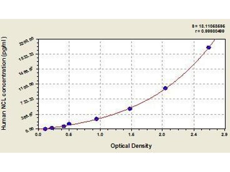 Antibody specific for NCL has been pre-coated onto a microplate. Standards and samples are pipetted into the wells and any NCL present is bound by the immobilized antibody. After removing any unbound substances, a biotin-conjugated antibody specific for NCL is added to the wells. After washing, avidin conjugated Horseradish Peroxidase (HRP) is added to the wells. Following a wash to remove any unbound avidin-enzyme reagent, a substrate solution is added to the wells and color develops in proportion to the amount of NCL bound in the initial step. The color development is stopped and the intensity of the color is measured.