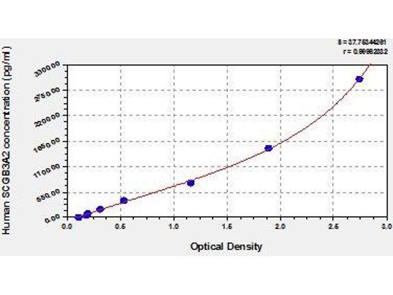 This assay employs the quantitative sandwich enzyme immunoassay technique. Antibody specific for SCGB3A2 has been pre-coated onto a microplate. Standards and samples are pipetted into the wells and any SCGB3A2 present is bound by the immobilized antibody. After removing any unbound substances, a biotin-conjugated antibody specific for SCGB3A2 is added to the wells. After washing, avidin conjugated Horseradish Peroxidase (HRP) is added to the wells. Following a wash to remove any unbound avidin-enzyme reagent, a substrate solution is added to the wells and color develops in proportion to the amount of SCGB3A2 bound in the initial step. The color development is stopped and the intensity of the color is measured.