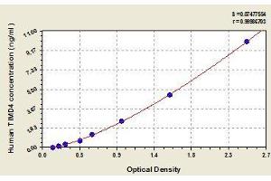 - Antibody specific for TIMD4 has been pre-coated onto a microplate. Standards and samples are pipetted into the wells and any TIMD4 present is bound by the immobilized antibody. After removing any unbound substances, a biotin-conjugated antibody specific for TIMD4 is added to the wells. After washing, avidin conjugated Horseradish Peroxidase (HRP) is added to the wells. Following a wash to remove any unbound avidin-enzyme reagent, a substrate solution is added to the wells and color develops in proportion to the amount of TIMD4 bound in the initial step. The color development is stopped and the intensity of the color is measured.