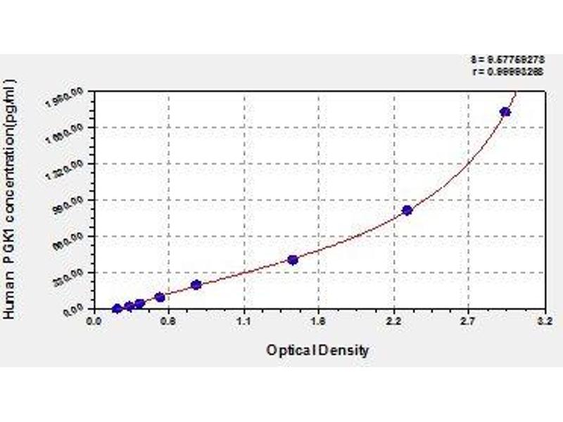 Antibody specific for PGK1 has been pre-coated onto a microplate. Standards and samples are pipetted into the wells and any PGK1 present is bound by the immobilized antibody. After removing any unbound substances, a biotin-conjugated antibody specific for PGK1 is added to the wells. After washing, avidin conjugated Horseradish Peroxidase (HRP) is added to the wells. Following a wash to remove any unbound avidin-enzyme reagent, a substrate solution is added to the wells and color develops in proportion to the amount of PGK1 bound in the initial step. The color development is stopped and the intensity of the color is measured.