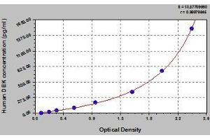- Antibody specific for DEK has been pre-coated onto a microplate. Standards and samples are pipetted into the wells and any DEK present is bound by the immobilized antibody. After removing any unbound substances, a biotin-conjugated antibody specific for DEK is added to the wells. After washing, avidin conjugated Horseradish Peroxidase (HRP) is added to the wells. Following a wash to remove any unbound avidin-enzyme reagent, a substrate solution is added to the wells and color develops in proportion to the amount of DEK bound in the initial step. The color development is stopped and the intensity of the color is measured.