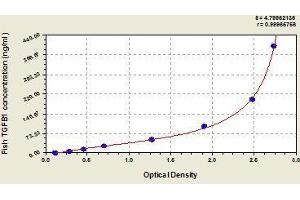 - The microtiter plate provided in this kit has been pre-coated with an antibody specific to fish TGFB1. Standards or samples are then added to the appropriate microtiter plate wells with a HRP-conjugated antibody preparation specific for fish TGFB1 to each microplate well and incubated. Then a TMB (3,3',5,5' tetramethyl-benzidine) substrate solution is added to each well. Only those wells that contain fish TGFB1, HRP-conjugated antibody will exhibit a change in color. The enzyme-substrate reaction is terminated by the addition of a sulphuric acid solution and the color change is measured spectrophotometrically at a wavelength of 450 nm ± 2 nm. The concentration of fish TGFB1 in the samples is then determined by comparing the O.D. of the samples to the standard curve.