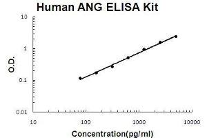 - human ANG ELISA Kit was based on standard sandwich enzyme-linked immune-sorbent assay technology. A monoclonal antibody from mouse specific for ANG has been precoated onto 96-well plates. Standards(E.coli, Q25-P147) and test samples are added to the wells, a biotinylated detection polyclonal antibody from goat specific for ANG is added subsequently and then followed by washing with PBS or TBS buffer. Avidin-Biotin-Peroxidase Complex was added and unbound conjugates were washed away with PBS or TBS buffer. HRP substrate TMB was used to visualize HRP enzymatic reaction. TMB was catalyzed by HRP to produce a blue color product that changed into yellow after adding acidic stop solution. The density of yellow is proportional to the human ANG amount of sample captured in plate.