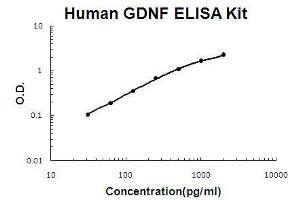 - human GDNF ELISA Kit was based on standard sandwich enzyme-linked immune-sorbent assay technology. A monoclonal antibody from mouse specific for GDNF has been precoated onto 96-well plates. Standards(NSO, R109-I211) and test samples are added to the wells, a biotinylated detection polyclonal antibody from goat specific for GDNF is added subsequently and then followed by washing with PBS or TBS buffer. Avidin-Biotin-Peroxidase Complex was added and unbound conjugates were washed away with PBS or TBS buffer. HRP substrate TMB was used to visualize HRP enzymatic reaction. TMB was catalyzed by HRP to produce a blue color product that changed into yellow after adding acidic stop solution. The density of yellow is proportional to the human GDNF amount of sample captured in plate.