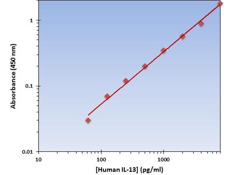 - This particular immunoassay utilizes the quantitative technique of a Sandwich Enzyme-Linked Immunosorbent Assay (ELISA) where the target protein (antigen) is bound in a sandwich format by the primary capture antibodies coated to each well-bottom and the secondary detection antibodies added subsequently by the investigator. The capture antibodies coated to the bottom of each well are specific for a particular epitope on the Human IL-13 cytokine while the user-added detection antibodies bind to epitopes on the captured target protein. Amid each step of the procedure, a series of wash steps must be performed to ensure the elimination of non-specific binding between proteins to other proteins or to the solid phase. After incubation and sandwiching of the target antigen, a peroxidase enzyme is conjugated to the constant heavy chain of the secondary antibody (either covalently or via Avidin/Streptavidin-Biotin interactions), allowing for a colorimetric reaction to ensue upon substrate addition. When the substrate TMB (3, 3’, 5, 5’- Tetramethylbenzidine) is added, the reaction catalyzed by peroxidase yields a blue color that is representative of the antigen concentration. Upon sufficient color development, the reaction can be terminated through addition of Stop Solution (2 N Sulfuric Acid) where the color of the solution will turn yellow. The absorbance of each well can then be read by a spectrophotometer, allowing for generation of a standard curve and subsequent determination of protein concentration.