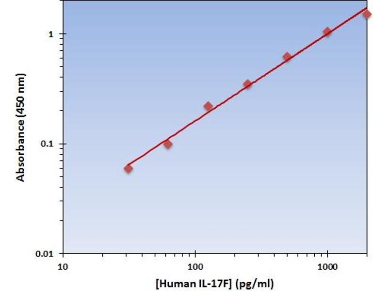 - This particular immunoassay utilizes the quantitative technique of a Sandwich Enzyme-Linked Immunosorbent Assay (ELISA) where the target protein (antigen) is bound in a sandwich format by the primary capture antibodies coated to each well-bottom and the secondary detection antibodies added subsequently by the investigator. The capture antibodies coated to the bottom of each well are specific for a particular epitope on the Human IL-17F cytokine while the user-added detection antibodies bind to epitopes on the captured target protein. Amid each step of the procedure, a series of wash steps must be performed to ensure the elimination of non-specific binding between proteins to other proteins or to the solid phase. After incubation and sandwiching of the target antigen, a peroxidase enzyme is conjugated to the constant heavy chain of the secondary antibody (either covalently or via Avidin/Streptavidin-Biotin interactions), allowing for a colorimetric reaction to ensue upon substrate addition. When the substrate TMB (3, 3’, 5, 5’- Tetramethylbenzidine) is added, the reaction catalyzed by peroxidase yields a blue color that is representative of the antigen concentration. Upon sufficient color development, the reaction can be terminated through addition of Stop Solution (2 N Sulfuric Acid) where the color of the solution will turn yellow. The absorbance of each well can then be read by a spectrophotometer, allowing for generation of a standard curve and subsequent determination of protein concentration.