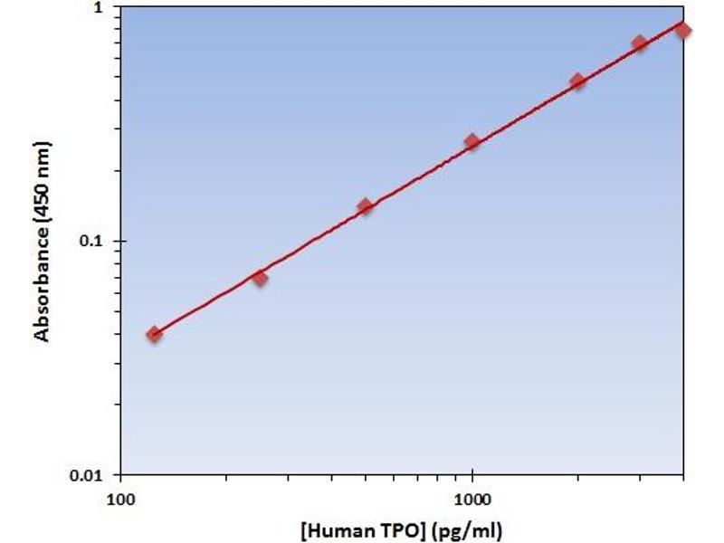 - The OmniKine? Human TPO ELISA Kit contains the components necessary for quantitative determination of natural or recombinant Human TPO concentrations within any experimental sample including cell lysates, serum and plasma. This particular immunoassay utilizes the quantitative technique of a "Sandwich" Enzyme-Linked Immunosorbent Assay (ELISA) where the target protein (antigen) is bound in a "sandwich" format by the primary capture antibodies coated to each well-bottom and the secondary detection antibodies added subsequently by the investigator. The capture antibodies coated to the bottom of each well are specific for a particular epitope on Human TPO while the user-added detection antibodies bind to epitopes on the captured target protein. Amid each step of the procedure, a series of wash steps must be performed to ensure the elimination of non- specific binding between proteins to other proteins or to the solid phase. After incubation and "sandwiching" of the target antigen, a peroxidase enzyme is conjugated to the constant heavy chain of the secondary antibody (either covalently or via Avidin/Streptavidin-Biotin interactions), allowing for a colorimetric reaction to ensue upon substrate addition. When the substrate TMB (3, 3', 5, 5'-Tetramethylbenzidine) is added, the reaction catalyzed by peroxidase yields a blue color that is representative of the antigen concentration. Upon sufficient color development, the reaction can be terminated through addition of Stop Solution (2 N Sulfuric Acid) where the color of the solution will turn yellow. The absorbance of each well can then be read by a spectrophotometer, allowing for generation of a standard curve and subsequent determination of protein concentration.