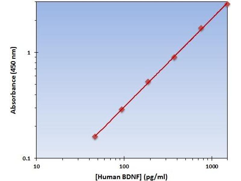 - The OmniKine? Human BDNF ELISA Kit contains the components necessary for quantitative determination of natural or recombinant Human BDNF concentrations within any experimental sample including cell lysates, serum and plasma. This particular immunoassay utilizes the quantitative technique of a "Sandwich" Enzyme-Linked Immunosorbent Assay (ELISA) where the target protein (antigen) is bound in a "sandwich" format by the primary capture antibodies coated to each well-bottom and the secondary detection antibodies added subsequently by the investigator. The capture antibodies coated to the bottom of each well are specific for a particular epitope on Human BDNF while the user-added detection antibodies bind to epitopes on the captured target protein. Amid each step of the procedure, a series of wash steps must be performed to ensure the elimination of non- specific binding between proteins to other proteins or to the solid phase. After incubation and "sandwiching" of the target antigen, a peroxidase enzyme is conjugated to the constant heavy chain of the secondary antibody (either covalently or via Avidin/Streptavidin-Biotin interactions), allowing for a colorimetric reaction to ensue upon substrate addition. When the substrate TMB (3, 3', 5, 5'-Tetramethylbenzidine) is added, the reaction catalyzed by peroxidase yields a blue color that is representative of the antigen concentration. Upon sufficient color development, the reaction can be terminated through addition of Stop Solution (2 N Sulfuric Acid) where the color of the solution will turn yellow. The absorbance of each well can then be read by a spectrophotometer, allowing for generation of a standard curve and subsequent determination of protein concentration.