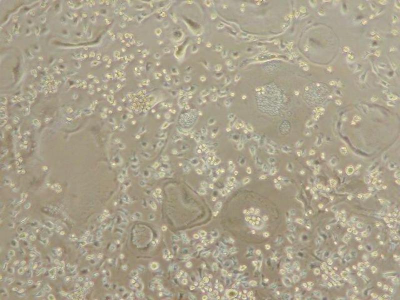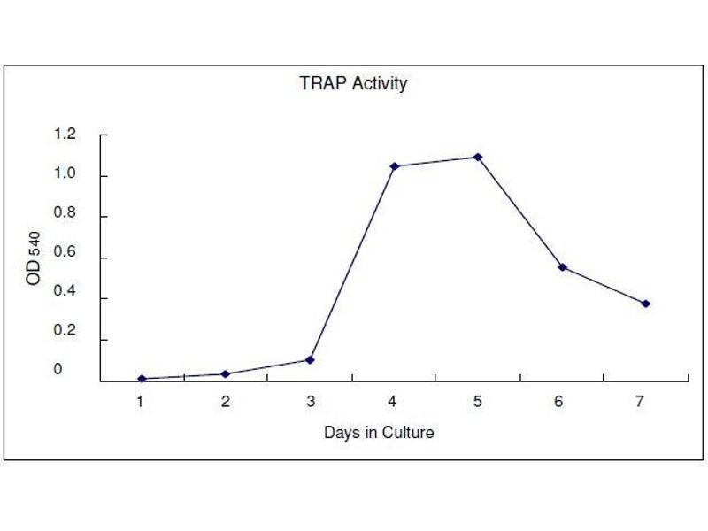 Thaw a vial of primary precursor osteoclasts in a 37°C water bath. 2. After thawing, transfer the cells to a 15 mL centrifuge tube, add 10 mL of Wash Medium and mix briefly. Centrifuge 1,000 rpm for 5 minutes at 4°C. 3. Remove supernatant and add 10 mL of Wash Medium and mix briefly. Centrifuge 1,000 rpm for 5 minutes at 4°C. 4. Remove supernatant and resuspend the cells in 2.5 5 mL of Culture Medium. To study factors that effect osteoclasts formation, add the factors to the Culture Medium. 5. Transfer 100 µL of cell suspension into each well of a 96-well plate. If the cells are resuspended in 5 mL of Culture Medium, there will be enough cell suspension for about 50 µLs. To quickly observe osteoclasts formation, culture the cells at a higher density. 6. Feed the cells with 100 µL of Culture Medium every 3 4 days. Cells will begin to fuse and form osteoclasts around day 5 (fig 1). 7. Count the osteoclasts by staining with tartrate-resistant acid phosphatase (TRAP Staining Kit,.