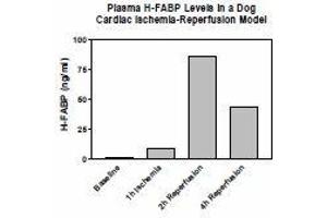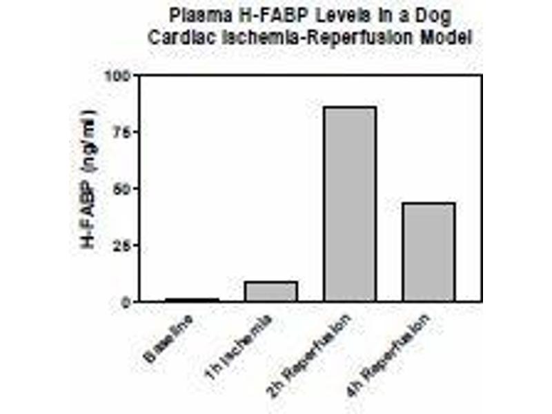 General Note: In plasma samples from a dog ischemia-reperfusion model we found that peak H-FABP levels of ~85 ng/mL were achieved 2h after reperfusion. Baseline levels were approximately 1 ng/mL. We suggest that samples initially be tested after a 5-fold dilution in 1x sample diluent.