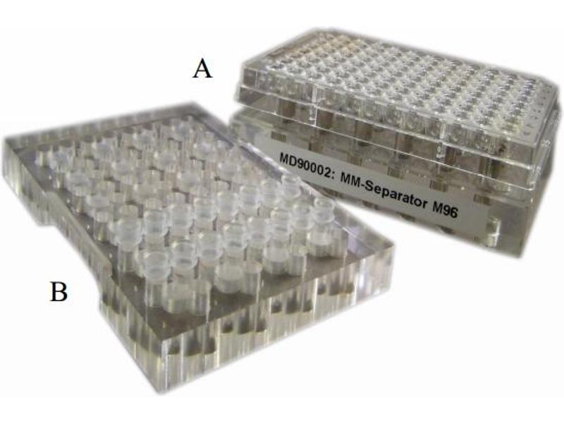 The adapter can be placed on the MM-Separator M96 and is suitable for users with smaller sample throughputs, preferring use of PCR tube strips over PCR plates.