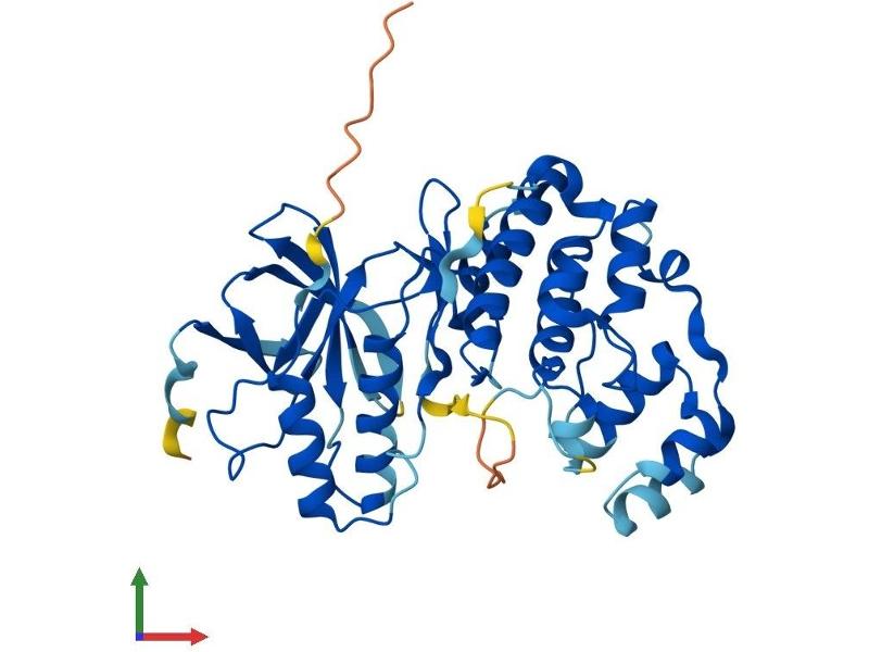 Activation of members of the mitogen-activated protein kinase family is a major mechanism for transduction of extracellular signals. Stress-activated protein kinases are one subclass of MAP kinases. The protein encoded by this gene functions as a signal transducer during differentiation of myoblasts to myotubes. [provided by RefSeq, Jul 2008].