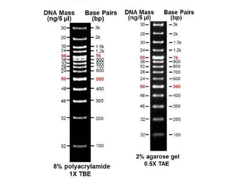 AccuBand™ 100 bp+3K DNA Ladder II is composed of 14 individual DNA fragments, presenting 3k, 2k, 1.5k, 1.2k, 1k, 900, 800, 700 600, 500, 400, 300, 200 and 100 bp sharp bands respectively. AccuBand™ 100 bp+3K DNA Ladder II provides a sufficient amount of DNA for clear observation of all DNA bands ranging from 100 bp to 3 kb, either in agarose gel or in polyacrylamide gel electrophoresis. AccuBand™ 100 bp+3K DNA Ladder II is ready-to-use, containing loading buffer with dual color tracking dyes (orange G and Xylene cyanol FF).