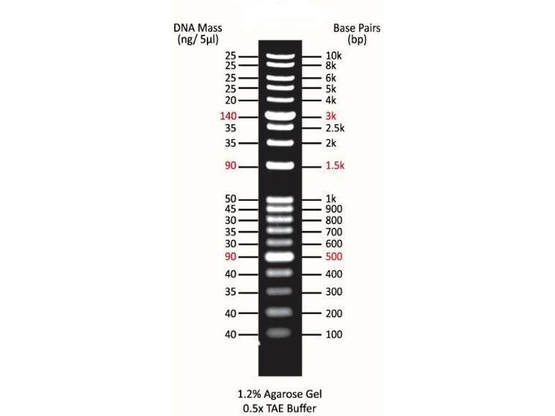 The ExcelBand 1 KB Plus (0.1-10 kb) DNA Ladder is a ready-to-use DNA ladder, which is pre-mixed with loading dye for direct loading on gel. The DNA Ladder is composed of 19 individual DNA fragments: 10k, 8k, 6k, 5k, 4k, 3k, 2.5k, 2k, 1.5k, 1k, 900, 800, 700, 600, 500, 400, 300, 200, and 100 bp derived from a mixture of PCR products and specifically digested plasmid DNA.