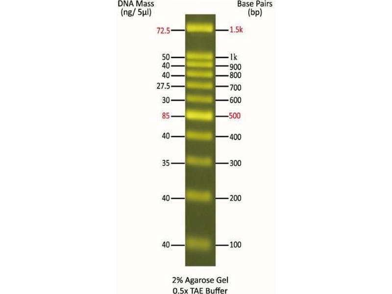 The FluoroBand 100 bp Fluorescent DNA Ladder is a ready-to-use DNA ladder, which is pre-mixed with high sensitivity DNA binding fluorescent dye and loading dye for direct loading on gel. The DNA Ladder is composed of 11 individual DNA fragments: 1.5k, 1k, 900, 800, 700, 600, 500, 400, 300, 200 and 100 bp derived from a mixture of PCR products and specifically digested plasmid DNA, these bands can be visualized when illuminated with 470 nm blue light or UV light.