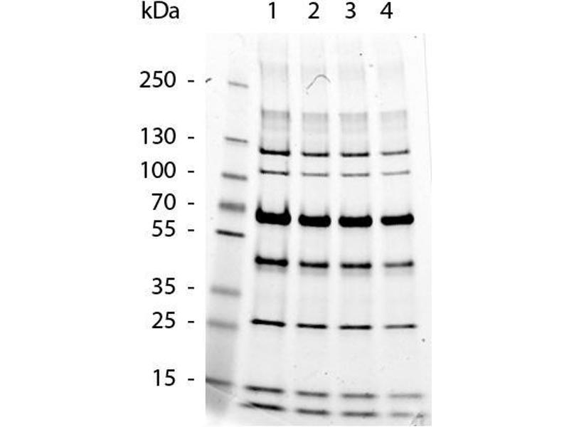 - The protein mixture has been formulated to yield well-defined bands after SDS-polyacrylamide gel electrophoresis and staining with Coomassie blue or other common staining techniques. The intensity of the 67 kDa bovine albumin band has been increased to serve as a reference. The product is supplied in 1X loading buffer and is ready-to-use.