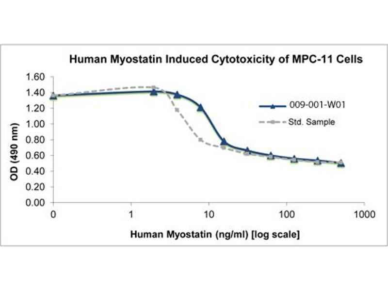 The protein encoded by this gene is a member of the bone morphogenetic protein (BMP) family and the TGF-beta superfamily. This group of proteins is characterized by a polybasic proteolytic processing site which is cleaved to produce a mature protein containing seven conserved cysteine residues. The members of this family are regulators of cell growth and differentiation in both embryonic and adult tissues. This gene is thought to encode a secreted protein which negatively regulates skeletal muscle growth. [provided by RefSeq, Jul 2008].