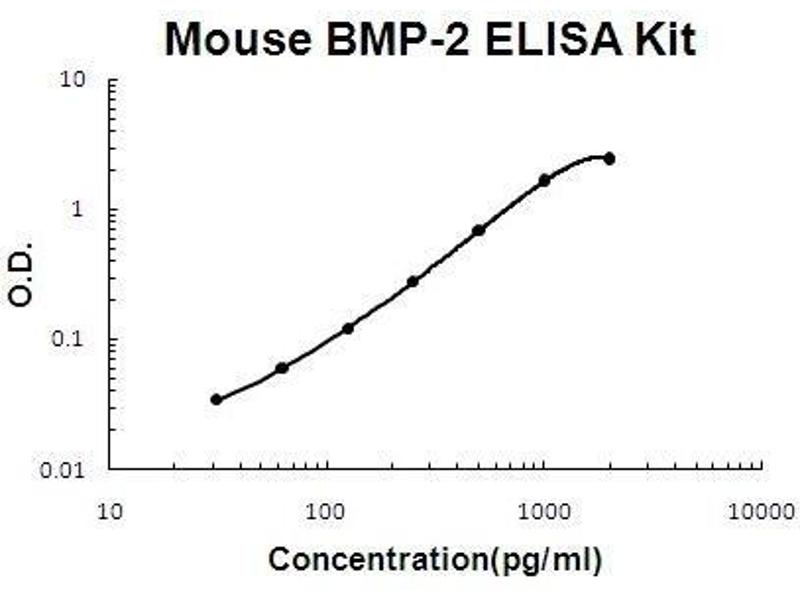 Background: Bone morphogenetic protein-2(BMP-2, BMP 2A) belongs to the transforming growth factor beta(TGF-beta) superfamily. It is thought to be involved in cartilage and bone formation during embryogenesis, but may have additional functions in morphogenesis as implied by its expression in various organs and embryonic tissues of mice. BMP-2 has been identified as a candidate mediator of retinoid activity. BMP-2 protein induces medulloblastoma cell apoptosis, whereas the BMP-2 antagonist noggin blocks both retinoid and BMP-2-induced apoptosis. BMP-2 also induces p38 mitogen-activated protein kinase(MAPK), which is necessary for BMP-2 and retinoid-induced apoptosis. Bone morphogenic proteins(BMPs) are known to promote osteogenesis, and clinical trials are currently underway to evaluate the ability of certain BMPs to promote fracture-healing and spinal fusion. The standard product used in this kit is recombinant mouse BMP-2, constituting dimer by two chains of 114 amino acids with the molecular mass of 26KDa.