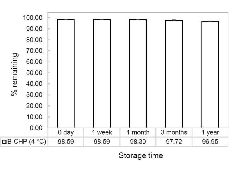 Make sure to tap vial down to ensure powder is at the bottom and that it does not fly out upon opening. Dissolve the 0.3 mg of peptide powder in 1 mL of pure water or phosphate-buffered saline (1x PBS), vortex well and centrifuge, to prepare a stock solution containing approximately 100 μM of CHP. Store the stock solution at 4 °C. Dilute the stock solution to assay dependent concentrations upon use. For the 60 μg products, dissolve the powder in 400 μL water or PBS to get a stock solution with a CHP concentration of 50 μM. For the 15 μg samples, dissolve in 100 μL water or PBS for a stock solution with the CHP concentration of 50 μM.