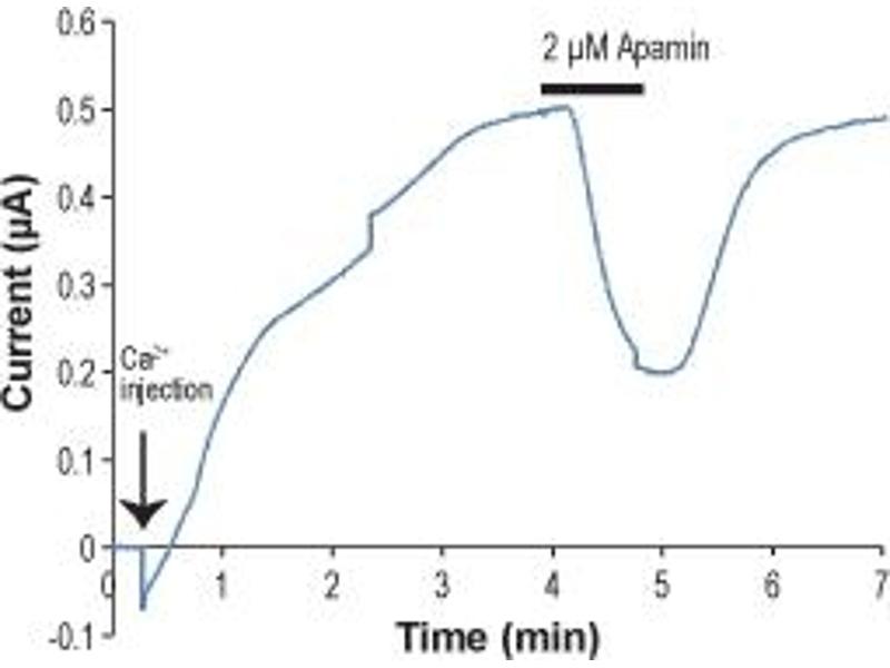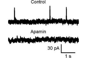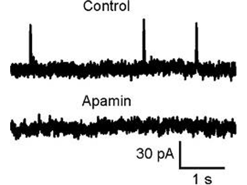 APM, Apamine,Apamin is a natural peptide isolated and purified from Apis mellifera bee venoM Apamin blocks small conductance Ca2+-activated K+ channels (SK). It is specific for the SK1-3 isoforms, but ineffective in blocking other calcium activated K+ channels2. In mammalian cell lines, Apamin blocks expressed hSK1 with an IC50 of ~10 nM3, rSK1 and rSK2 with IC50 of ~3 and