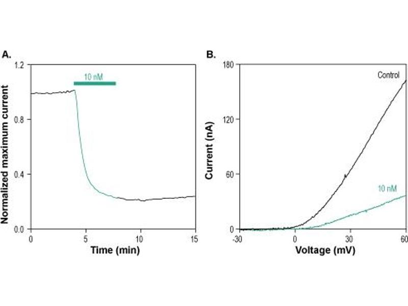 K+ channel toxin ShK, Toxin κ-stichotoxin-She3a, Kappa-stichotoxin-She3a, κ-SHTX-She3a,ShK (Stichodactyla Toxin) is a peptide toxin originally isolated from the nematocyst of the sea anemone Stichodactyla helianthus1.ShK blocks KV1.3, KV1.1, KV1.4, and KV1.6 at subnanomolar concentrations and KV3.2 channels at 1000-fold higher concentration than that required to inhibit KV1.3 channels. It has been shown to block KV current in DRG neurons, to displace radioactive Dendrotoxin from brain synaptosomes1 and inhibit I125-Charybdotoxin binding to Jurkat T lymphocytes with an IC50 of 32 pM2,4.Evidence also suggests that native KV currents in the central nervous system, which are predominantly carried by KV1.2 channels, are highly sensitive to this toxin5.A fluorescently labeled synthetic ShK is used to recognize and to sort KV1.3 containing lymphocytes4,6.