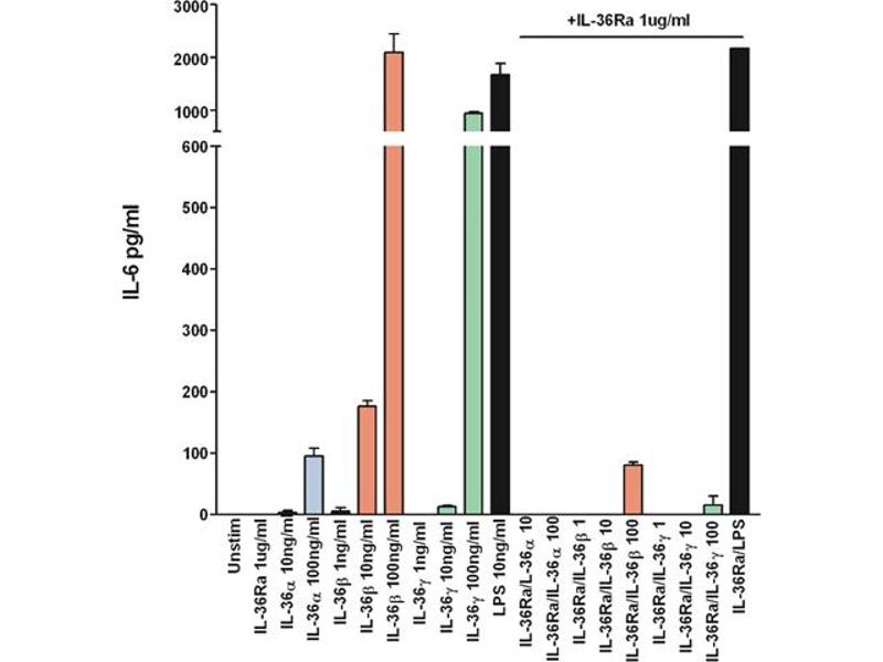 - Inhibits the IL-6 induced expression of IL-36alpha (IL-1F6), IL-36beta (IL-1F8), and IL-36gamma (IL-1F9) in BMDCs. 1μg/ml of IL-36Ra inhibits the activity of 10 ng to 100 ng/ml of the agonists.