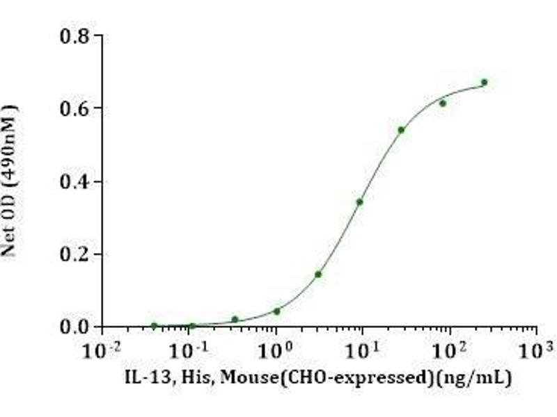 Interleukin 13 (IL-13) is an immunoregulatory cytokine produced primarily by activated Th2 cells, and also by mast cells and NK cells. Targeted deletion of IL-13 in mice resulted in impaired Th2 cell development and indicated an important role for IL-13 in the expulsion of gastrointestinal parasites. IL-13 exerts anti-inflammatory effects on monocytes and macrophages and it inhibits the expression of inflammatory cytokines such as IL-1beta, TNF-alpha, IL-6 and IL-8. IL-13 has also been shown to enhance B cell proliferation and to induce isotype switching resulting in increased production of IgE. Blocking of IL-13 activity inhibits the pathophysiology of asthma. Human and mouse IL-13 is cross-species reactive.Recombinant human interleukin 13 expressed in CHO cells is glycosylated protein with molecular weight range from 25 to 45 kDa shown in non-reducing SDS-PAGE.