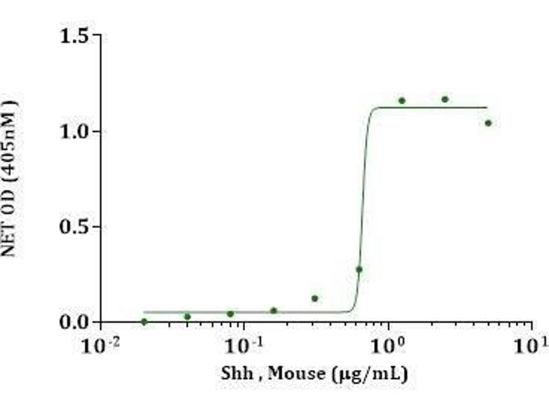 Sonic Hedgehog (Shh) is a member of the Hedgehog (Hh) family of highly conserved proteins which are widely represented throughout the animal kingdom. In mammal, there are threerelatedHh proteins, Sonic (Shh), Desert (Dhh) and Indian (Ihh). They share a high degree of amino-acid sequence identity (e.g., Shh and Ihh are 93 % identical). Sonic Hedgehog plays a role in cell growth, cell specialization, and the normal shaping (patterning) of the body. Shh is also important for development of the brain and spinal cord (central nervous system), eyes, limbs, and many other parts of the body. Recombinant mouseSonic Hedgehog(rmShh) produced in E.coli is a single non-glycosylated polypeptide chain containing 176 amino acids. A fully biologically active molecule, rmShh,is obtained by proprietary chromatographic techniques with a molecular mass of 19.8 kDa analyzed by reducing SDS-PAGE.