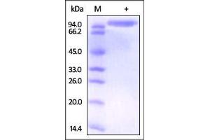 - This protein carries no "tag". The protein has a calculated MW of 85.4 kDa. The protein migrates as 95 kDa under reducing (R) condition (SDS-PAGE) due to glycosylation.