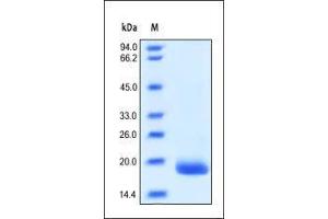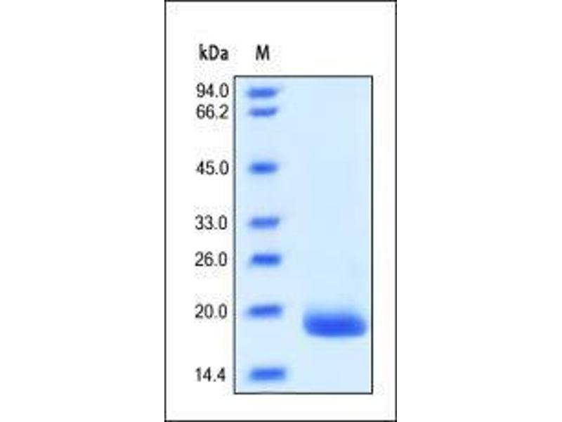 - This protein carries no "tag". The protein has a calculated MW of 18.7 kDa. The protein migrates as 18-21 kDa under reducing (R) condition (SDS-PAGE) due to Glycosylation.