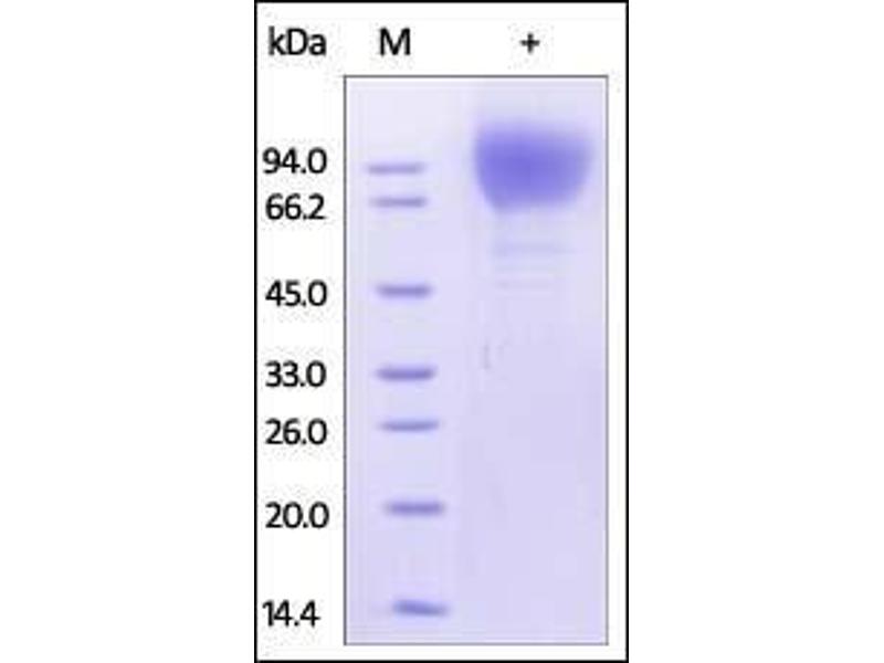 - This protein carries a polyhistidine tag at the C-terminus. The protein has a calculated MW of 54 kDa. The protein migrates as 65-110 kDa under reducing (R) condition (SDS-PAGE) due to glycosylation.