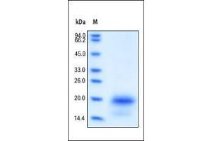 - This protein carries no "tag". The protein has a calculated MW of 14.9 kDa. The protein migrates as 15 and 19 kDa under reducing (R) condition (SDS-PAGE) due to glycosylation.