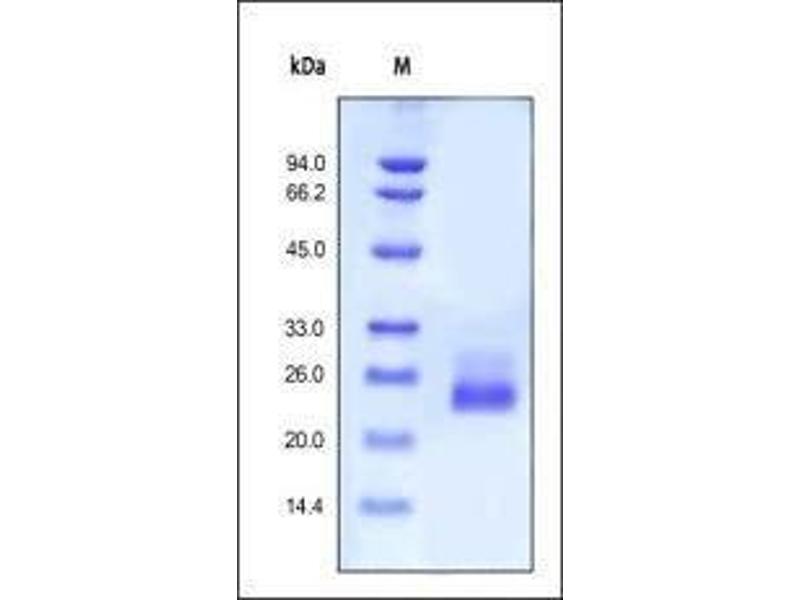 - This protein carries no "tag". The protein has a calculated MW of 20.8 kDa. The protein migrates as 24-27 kDa under reducing (R) condition (SDS-PAGE) due to different glycosylation.