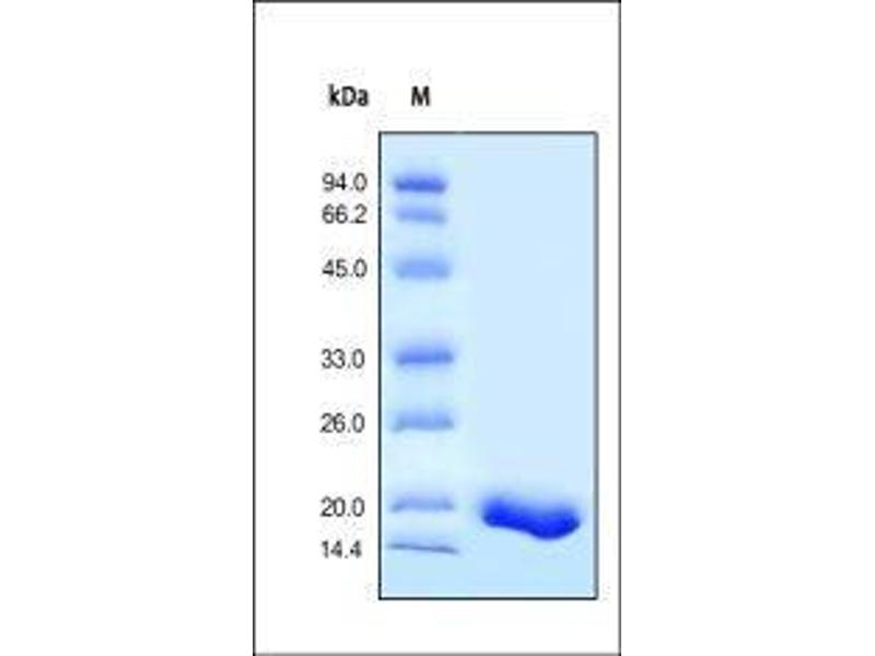 - This protein carries no "tag". The protein has a calculated MW of 17.4 kDa. The protein migrates as 18 kDa under reducing (R) condition (SDS-PAGE).
