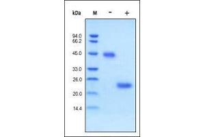 - This protein carries no "tag". The protein has a calculated MW of 19 kDa (monomer). As a result of glycosylation, the protein migrates as 24 kDa (monomer) under reducing (R) condition, and 43-50 kDa (homodimer) under non-reducing (NR) condition (SDS-PAGE).