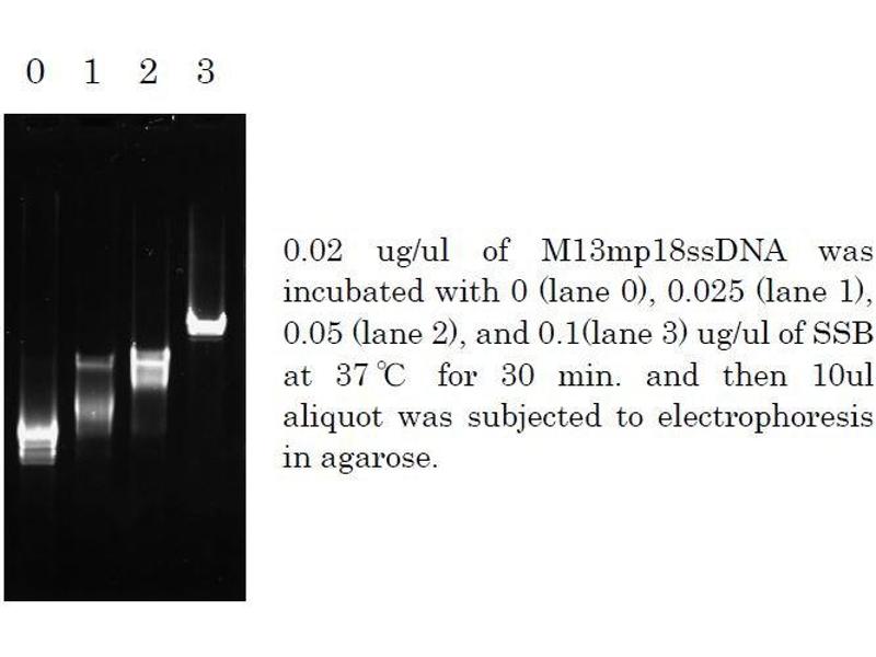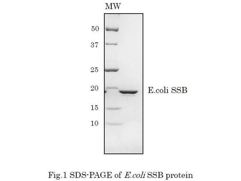 - E.coli single-stranded DNA binding protein (SSB) binds to single-stranded DNA with high specificity. It is involved in DNA replication and recombination in vivo. The SSB gene was expressed as the recombinant protein in E.coli highly purified. The molecular mass is 18.9 kDa.