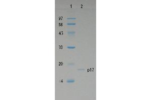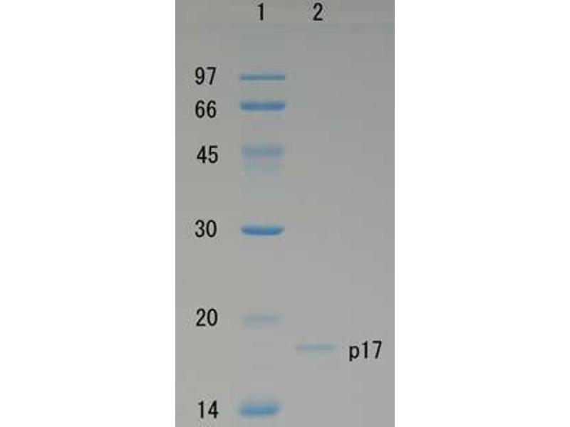 - HIV-1 Gag p17 is the matrix protein of AIDS virus, HIV-1, and is produced by digestion of its precursor Gag p55 by HIV-1 protease. This protein is indispensable for reproduction of AIDS virus and is essential component of AIDS virus particles. This protein was over-expressed as a recombinant protein in E. coli with a plasmid carrying the Gag p17 coding region of HIV-1 virus, subtype B, and was highly purified by several steps of chromatography. Its molecular weight is 17 kD, same as that of p17 purified from AIDS virus particles.
