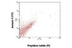 - Annexin V (or Annexin A5) is a member of the annexin family of intracellular proteins that binds to phosphatidylserine (PS) in a calcium-dependent manner. PS is normally only found on the intracellular leaflet of the plasma membrane in healthy cells, but during early apoptosis, membrane asymmetry is lost and PS translocates to the external leaflet. Fluorochrome-labeled Annexin V can then be used to specifically target and identify apoptotic cells. Annexin V Binding Buffer (cat. no. 422201) is recommended for use with Annexin V staining.Annexin V binding alone cannot differentiate between apoptotic cells and necrotic. So, we recommend using our 7-AAD Viability Staining Solution (cat. no. 420403/420404) or Propidium Iodide Solution (cat. no. 421301). Early apoptotic cells will exclude 7-AAD and PI, while late stage apoptotic cells and necrotic cells will stain positively, due to the passage of these dyes into the nucleus where they bind to DNA.