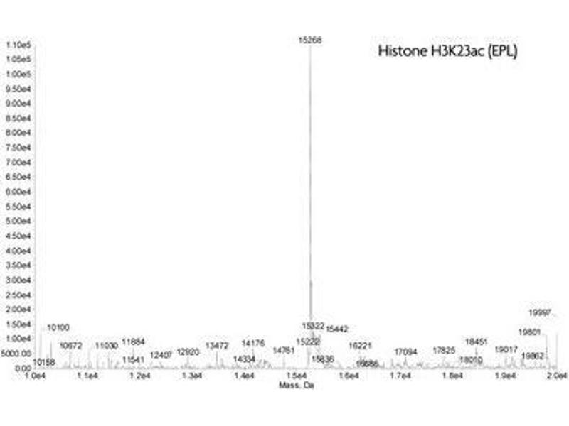 - Recombinant Histone H3 acetyl Lys23 (H3K23ac) proteins are generated using expressed protein ligation (EPL) technology. Truncated human Histone H3.2 is produced in E. coli and purified using FPLC. The purified protein is subsequently ligated to a N-terminal histone tail peptide containing acetylated lysine 23 via a native peptide bond. The full-length protein is then repurified prior to lyophilization. Protein concentration was determined using the molar extinction coefficient for Histone H3 and absorbance at 280nm. The recombinant histone is >98 % pure by SDS-PAGE and confirmed by high-resolution ESI-TOF mass spectrometry. The molecular weight of the recombinant histone is 15,268 Daltons.