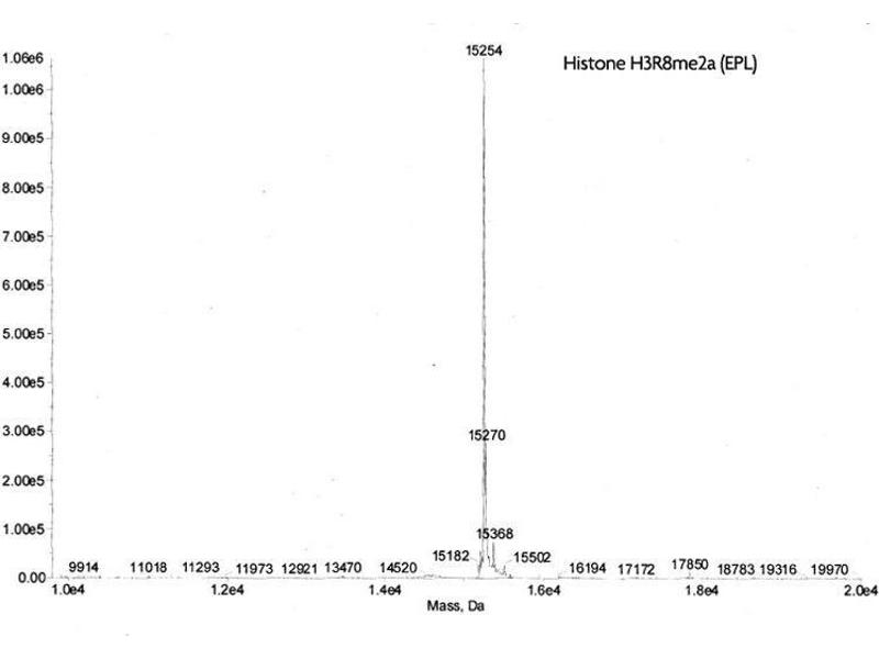 - Recombinant Histone H3 dimethyl Arg8 asymmetric (H3R8me2a) proteins are generated using expressed protein ligation (EPL) technology. Truncated human Histone H3.2 is produced in E. coli and purified using FPLC. The purified protein is subsequently ligated to a N-terminal histone tail peptide containing asymmetric dimethyl arginine 8 via a native peptide bond. The full-length protein is then repurified prior to lyophilization. Protein concentration was determined using the molar extinction coefficient for Histone H3 and absorbance at 280nm. The recombinant histone is >98 % pure by SDS-PAGE and confirmed by high-resolution ESI-TOF mass spectrometry. The molecular weight of the recombinant histone is 15,254 Daltons.
