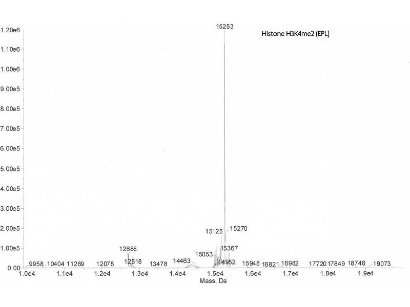 - Recombinant Histone H3 dimethyl Lys4 (H3K4me2) proteins are generated using expressed protein ligation (EPL) technology. Truncated human Histone H3.2 is produced in E. coli and purified using FPLC. The purified protein is subsequently ligated to a N-terminal histone tail peptide containing dimethyl lysine 4 via a native peptide bond. The full-length protein is then repurified prior to lyophilization. Protein concentration was determined using the molar extinction coefficient for Histone H3 and absorbance at 280nm. The recombinant histone is >98 % pure by SDS-PAGE and confirmed by high-resolution ESI-TOF mass spectrometry. The molecular weight of the recombinant histone is 15,253 Daltons.